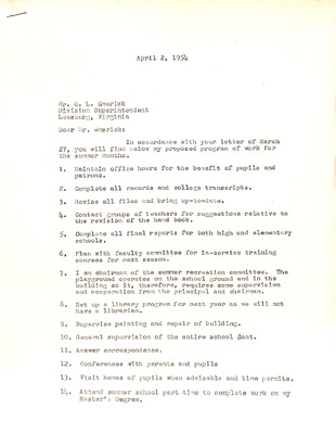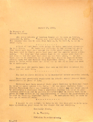 August 22, 1944 correspondence from Superintendent O.L. Emerick citing highlights of the 1944-45 school year. Highlights include: date of 1st day of school, compulsory attendance law, traffic laws around school buses while loading or unloading students, authorized school bus passengers