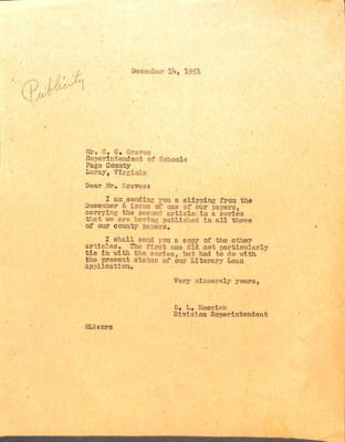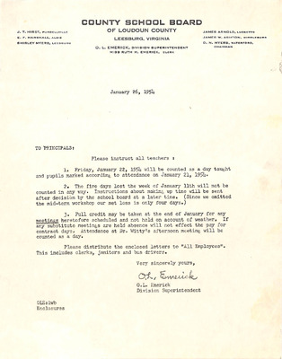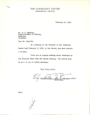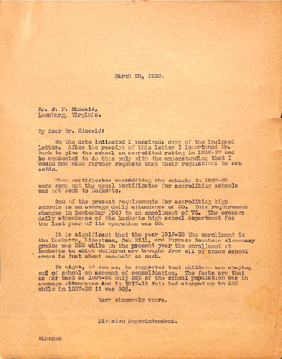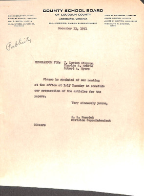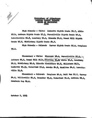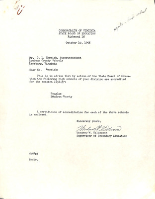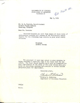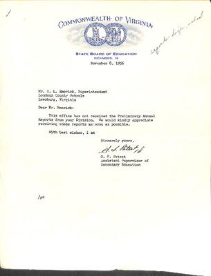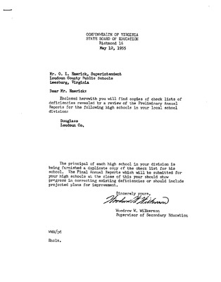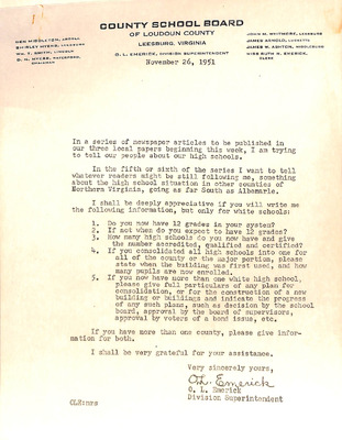 EWP 03 May 14, 1953 correspondence from O.L. Emerick that two, Loudoun, colored schools would be closing and those students would transfer to Fairfax