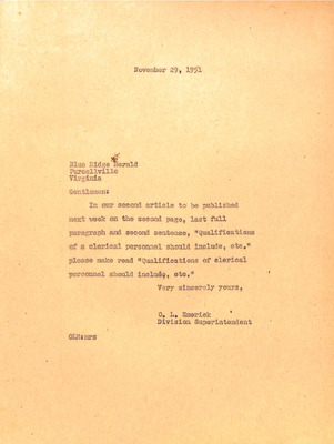EWP 03 May 14, 1953 correspondence from O. L. Emerick notifying Nokes school closure and students transportation by bus to Herndon school