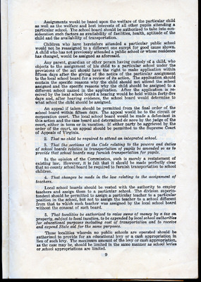 Page 9 of the Gray Commission Report outlines the proposed process for student assignments, emphasizing that decisions should be based on factors such as school facilities, student welfare, and transportation availability, while ensuring that no child is forced to attend an integrated school. It establishes a formal appeal process for parents who object to school assignments, allowing for hearings at the local level and further appeals to higher courts. Additionally, the report recommends clarifying school transportation policies, reinforcing local control over teacher assignments, and permitting localities to raise and allocate funds for education, including transportation costs, while maintaining the option for funding alternatives in areas without public schools.