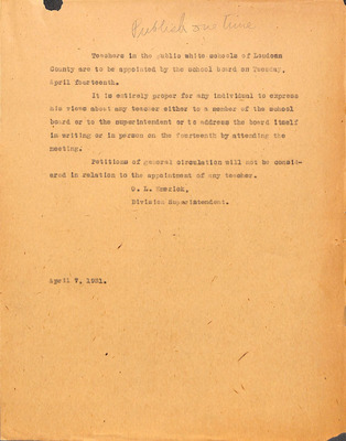 EWP 2-5-B Yr 1918 Lovettsville HS wants removal of Milton S. Harper