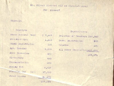 EWP 2-5B Yr 1926 Receipts and Expenditures for Mt. Gilead District In the school district of Mt. Gilead in 1926-27, expenditures totaled $37,069, with the majority going towards salaries of teachers at $29,080. Other significant expenses included standard electricity at $1,600, agricultural teacher salaries at $1,333, and rural supervision costs at $1,040. The district also allocated funds for home economics, elementary education, and transportation. The funding for these expenditures came from various sources, including state general funds, county taxes, district taxes, and other income.