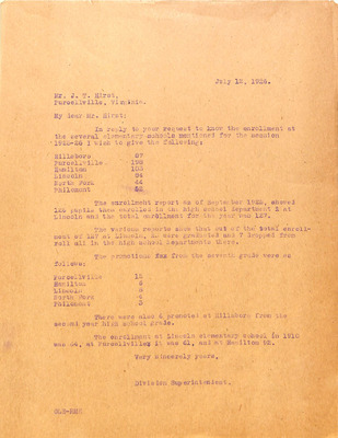 EWP 2-5B Yr 1926 July 12 Enrollment Statistics In a letter the Division Superintendent Omerick responded to Mr. J. T. Hirst of Purcellville, Virginia, providing enrollment numbers dated July 12, 1926, for several elementary schools for the 1925-26 school year. The letter listed enrollment figures for Hillsboro, Purcellville, Hamilton, Lincoln, North Fork, and Philomont. It noted that there were 126 pupils enrolled in the high school department at Lincoln in September 1925, with a total enrollment of 127 for the year. The report indicated that 25 students graduated and 7 dropped out from the high school department at Lincoln. Additionally, promotions from the seventh grade were detailed for each school. Also, Historical enrollment numbers from 1910 were provided for Lincoln, Purcellville, and Hamilton.