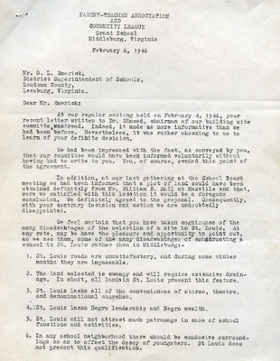March 20, 1945 County-Wide League of Loudoun letter to Superintendent Emerick and School Board endorses Janie Redmond recommendations made on March 6, 1945. These included Teacher Grade load decrease through school consolidation, providing necessary transportation, building repairs, school supply requests, infrastructure upgrades, additional teachers and maintenance custodians