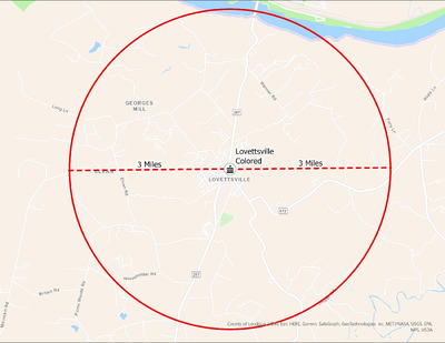 EWP 09 Lovettsville Colored with 3 mile It's estimated that the maximum distance students would have walked to this school is 3 miles one way. The graphic shows the area from which students may have walked to this school. - EWP Lovettsville Colored History