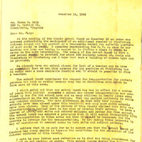 Dec 14, 1944 correspondence from Superintendent O.L. Emerick to attorney James Raby. The letter authorized an additional teacher for the Middleburg Colored School. School Board supports building a new (colored?) school near St Louis & Middleburg. The School Board could not act on a request for public school transportation but did offer to financially compensate parents who arranged private transportation. Letter states that Loudoun County School Board is interested in improving the education conditions of its colored children.