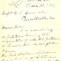 On April 26, 1927, G.H. Smart wrote a letter to Superintendent O.L. Emerick of Purcellville, VA on behalf of the patrons of Lenah School, requesting that their current teacher be re-elected for the upcoming school year. The letter, signed by all patrons except Mr. H. Byrne, praised the teacher's dedication and interest in the school and students. The patrons expressed their dissatisfaction with Mr. Byrne and urged the School Board to give careful consideration to re-electing their current teacher for the 1927-28 academic year. The letter was signed by several prominent community members including George Powell, Mrs. R.L. Allison, Mrs. James Leel, Mrs. X C. Poland